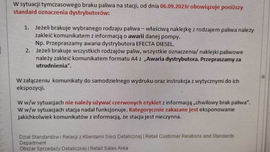 Wielu zaczęło podejrzewać, że ma to związek z e-mailem, do którego na początku września dotarł portal money.pl. Zawarto w nim procedurę postępowania na ewentualność braku paliwa. Wśród wytycznych znajduje się informacja mówiąca o tym, że w przypadku braku konkretnego rodzaju paliwa, obsługa powinna zakleić naklejkę komunikatem informującym o awarii pompy.