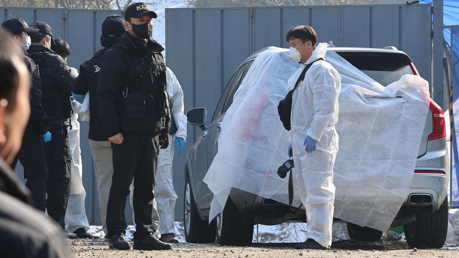 epa11045154 Police examine a car at a park in Seoul, South Korea, 27 December 2023, as actor Lee Sun-kyun of the Oscar-winning 'Parasite' was found dead inside the car in an apparent suicide earlier in the day. A charcoal briquette was found in the passenger seat. Lee has been under a prosecution probe over suspected drug use.  EPA/YONHAP SOUTH KOREA OUT