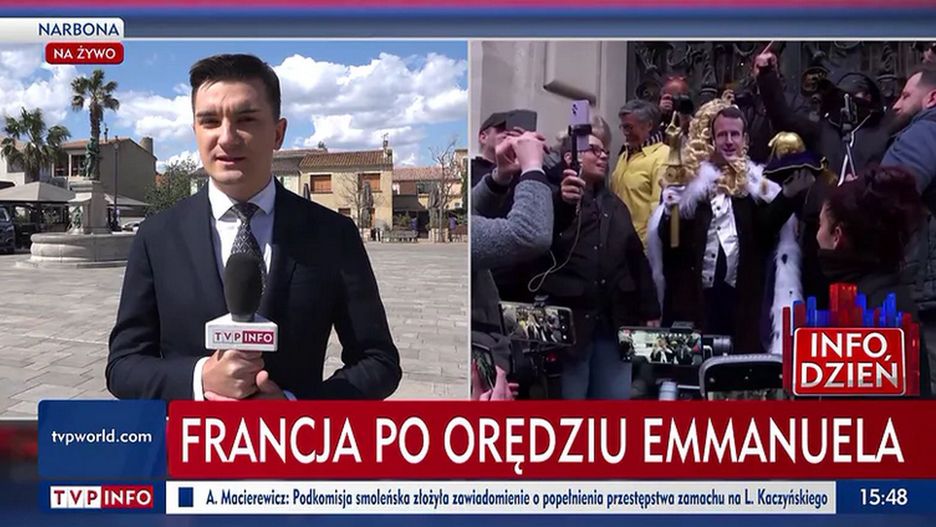 Wpadka "paskowych" pojawiła się we wtorkowym materiale korespondenta TVP Info z Francji, który relacjonował zamieszki związane z reformą emerytalną. Kiedy reporter Lucjan Olszówka wspominał na antenie o orędziu prezydenta Emmanuela Macrona, na ekranie można było zobaczyć następujący pasek: "Francja po orędziu Emmanuela".