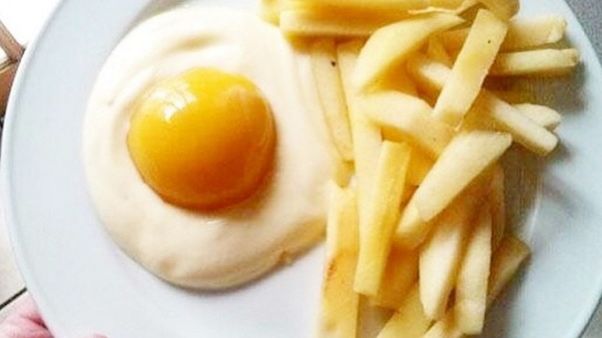 Jajko sadzone z brzoskwini i jogurtu z dodatkiem frytek z jabłka? Śniadanie primaaprilisowych mistrzów ;)