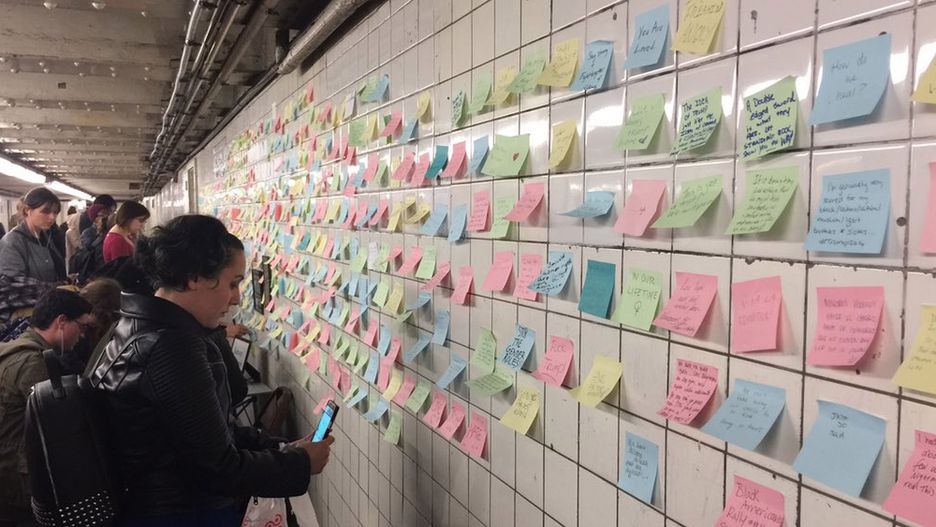 Na karteczkach pojawiają się słowa jak "Kocham to miasto i ten kraj", "Płaczę nad losem naszych dzieci i USA", "Żałuję mojego głosu", "Nie zdołasz nas podzielić, miłość zwycięży" czy "Czas zacząć walczyć".