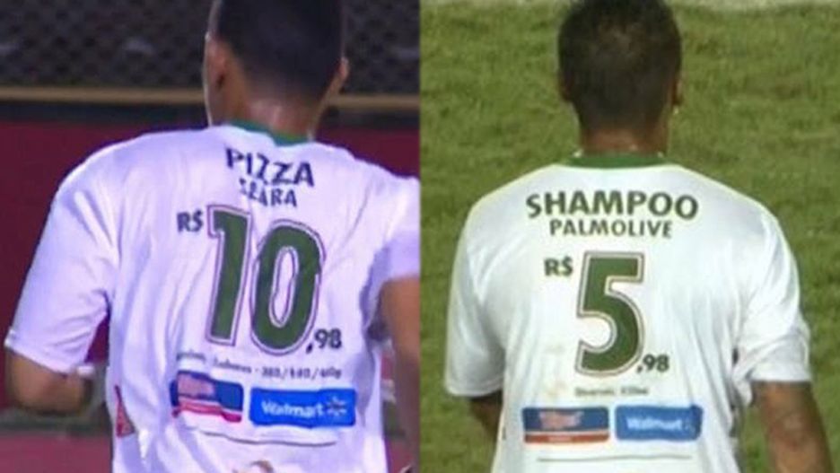 Gdy brakuje pieniędzy, umowa z bogatym sponsorem może uzupełnić nadwątlony budżet. Na ile jednak powinna godzić się drużyna, żeby dostać pieniądze? Ktoś w brazylijskim Walmarcie uznał, skoro i tak już na koszulkach drukuje się cyferki, to czemu by nie dopisać produktów, które można za taką czy inną sumę w realach kupić. Fluminense de Feira zgodziło się. I tak gwiazda drużyny Fernando Sobral nie jest już 10-ką, tylko 10,98 reali, ceną za mrożoną pizzę.