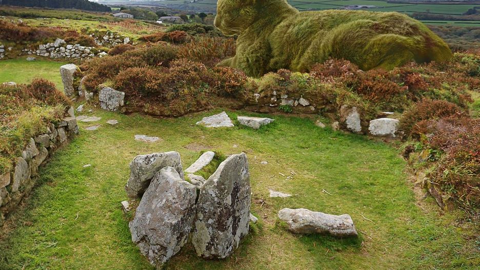 Saunders umieścił postać gigantycznego kota na malowniczych krajobrazach z rodzinnej Kornwalii.
