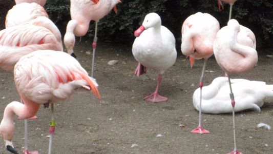 Nawet gęś walczy o akceptację flamingów. Może nie być łatwo.