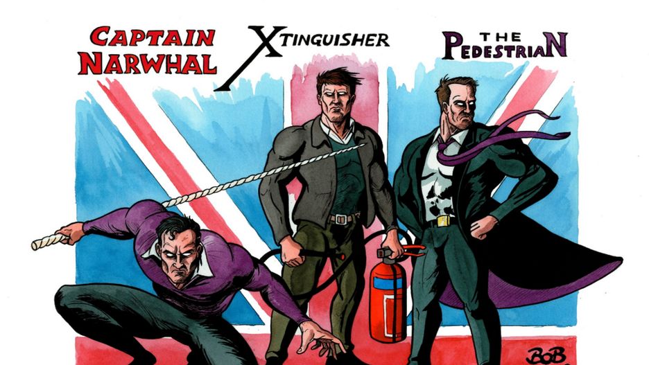 Rysownik nadał mężczyznom superbohaterskie pseudonimy. Łukasz został Kapitanem Narwalem, a jego towarzysze otrzymali miana "X Tinguisher" – Anglik z gaśnicą – i The Pedestrian, czyli po prostu przechodzień. Ilustracja została opublikowana na Twitterze, na koncie Boba Morana.