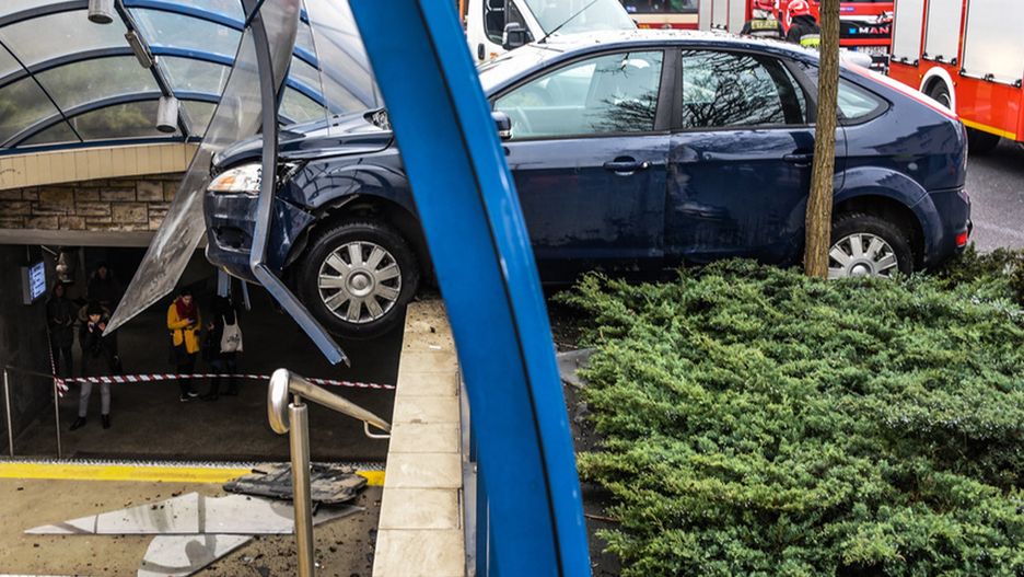 Ford Focus przebił się przez obudowę wiaty. Elementy konstrukcji posypały się do środka.