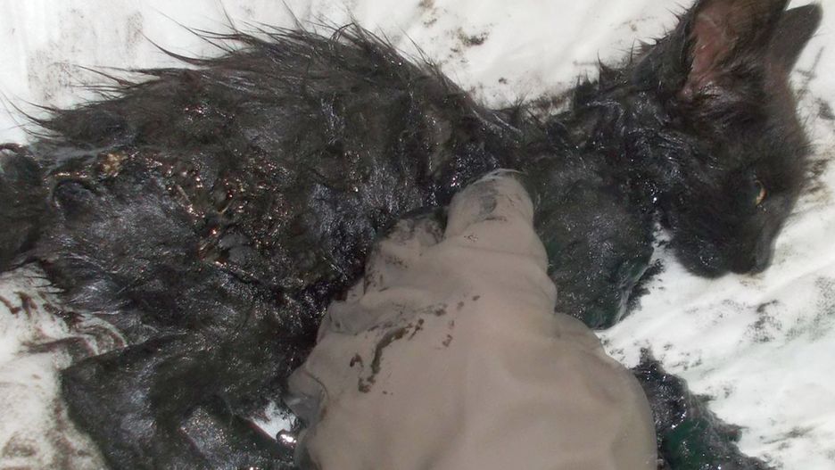 Smoły nie było na tyle dużo, by przykryła głowę kota. Tylko dzięki temu miał szansę przeżyć.