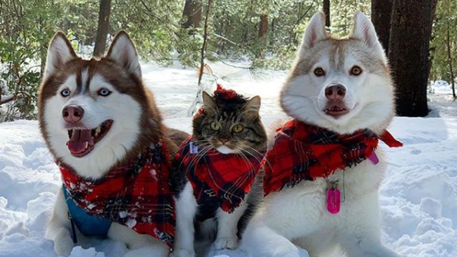 Wszystkie święta zwierzęta spędzają wspólnie. Husky są przebierane za renifery, a kot za świętego Mikołaja.