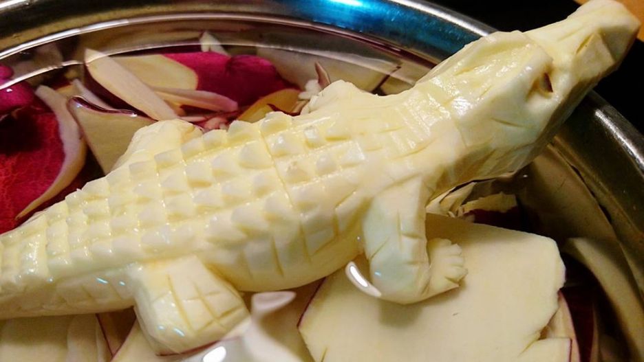 Mogłoby się wydawać, że Gaku po prostu lubi sobie podłubać w jedzeniu, ale to, co on robi, w Japonii nosi nazwę "mukimono". Jest to sztuka obierania i ozdobnego wycinania warzyw i owoców, traktowana tam bardzo poważnie. A Gaku jest całkiem niezłym artystą.