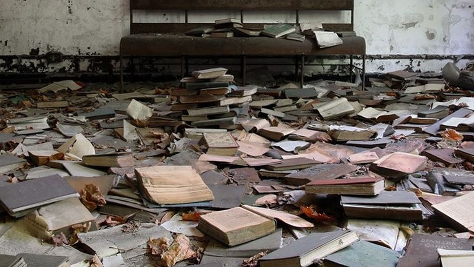 To ponure zdjęcie przedstawia dawną kolonię dla trędowatych, usytuowaną na jednej z wysp Nowego Jorku. Porozrzucane książki potęgują niepokojące wrażenie.