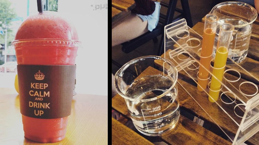 Szklanki to pieśń przeszłości. Teraz soki i napoje podaje się w plastikowych kubkach ze słomką, które z łatwością można zabrać ze sobą. Ale czy piliście kiedykolwiek coś z probówek? Człowiek od razu czuje się jak na lekcji chemii. Z tym, że tam raczej przestrzegali, żeby niczego nie pić...