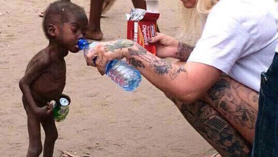 Dwuletni chłopiec, wyrzucony przez rodzinę na ulicę, trafił pod skrzydła wytatuowanej Dunki prowadzącej w Nigerii ośrodek pomocy dzieciom. Przeklęty przez najbliższych (bo ma niepoprawnie wykształcone genitalia), skazany został na śmierć głodową. Zdjęcie z Anją Loven podającą wodę małemu szkielecikowi obiegło cały świat.