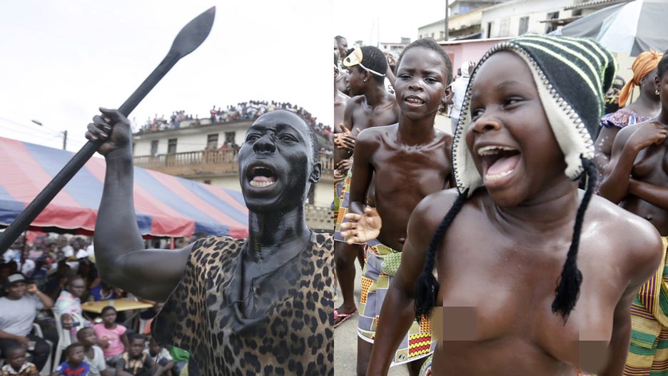 Gdy młode półnagie kobiety Aboure tańczą radośnie, młodzi mężczyźni odgrywają rolę groźnych wojowników szykujących się do walki.