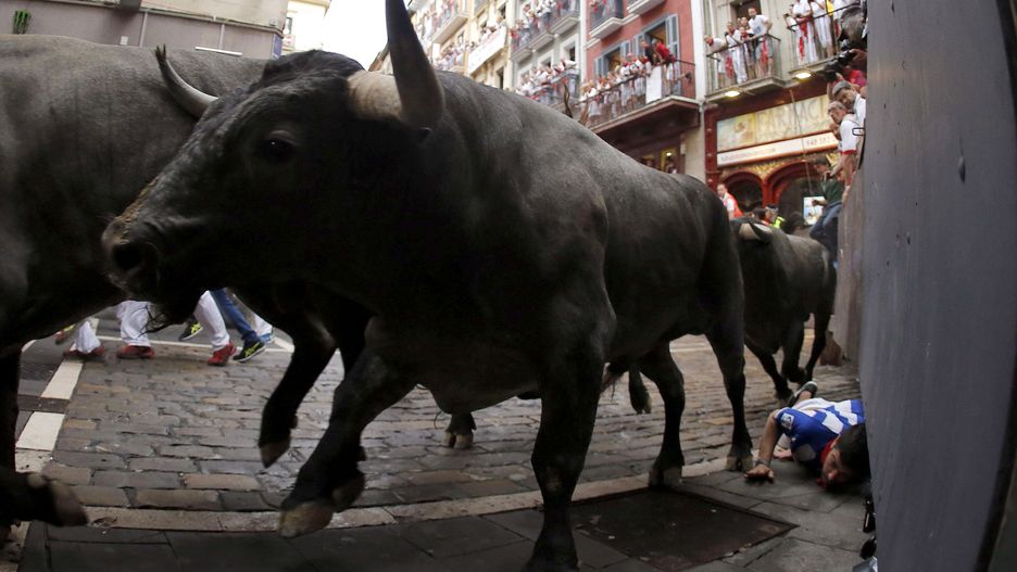 Każdego dnia o godz. 8 rano tłum ubranych na biało osób umyka przed gromadą byków. Jedno ze zwierząt prawym rogiem złapało jednego z uciekinierów między pośladkami i uniosło. Mężczyzna trafił do szpitala.