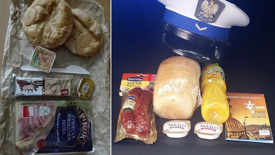 To wygląda tak, jakby swój suchy prowiant policjant zabrał wprost z domu. Jest zagrycha, a nawet coś słodkiego, ale brakuje popitki.