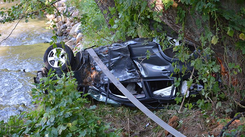 Samochód zjechał na lewą stronę jezdni, przerwał barierę energochłonną, przeleciał nad rzeką i na drugim jej brzegu uderzył prawym bokiem w pobliskie drzewa, po czym przewrócił się na dach.