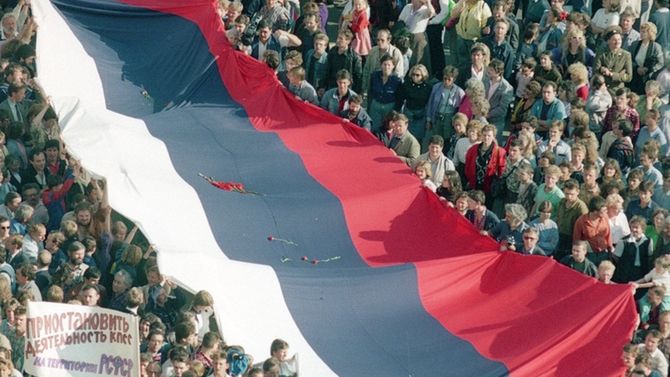 Tysiące moskwian niosą flagę, świętując niepowodzenie puczu Janajewa. Była to nieudana próba przejęcia władzy przez tzw. "twardogłowych" liderów KPZR chcących za wszelką cenę nie dopuścić do upadku ZSRR. Tak wyglądała młoda Rosja po rozpadzie Związku Radzieckiego. Zobaczcie najciekawsze fotografie, które przybliżają ducha tamtych lat.