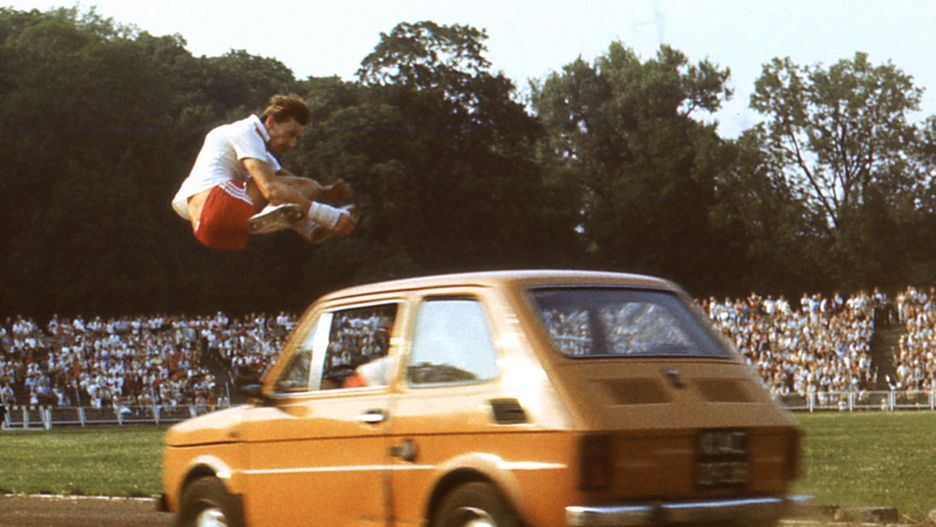 Czesław Górski robi stójkę na fiacie, za kierownicą Piotr Juszczyk. W wideo poniżej Juszczyk opowiada o tym, jak został kaskaderem.