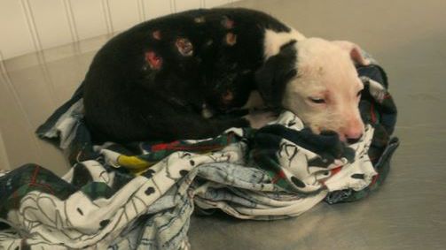 Malutki Jake miał dużo szczęścia, gdyż zauważył go jeden ze strażaków, gaszących pożar. William Lindler wyniósł go z płonącej pułapki. Piesek trafił do weterynarza, który stwierdził u niego poparzenie ciała aż w 75%. Wkrótce potem jego właściciele przestali kontaktować się z lekarzem... i szczeniak został pozostawiony sam sobie.