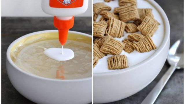 Płatki szybko nasiąkają mlekiem, nie tylko tracąc swój świeży wygląd, ale też tonąc na dnie talerza. Fotografowie zastępują więc mleko białym klejem. Dzięki temu płatki utrzymają się na powierzchni i zachowają swoją oryginalną formę. To tylko jedna z wielu sztuczek stosowanych w reklamie.