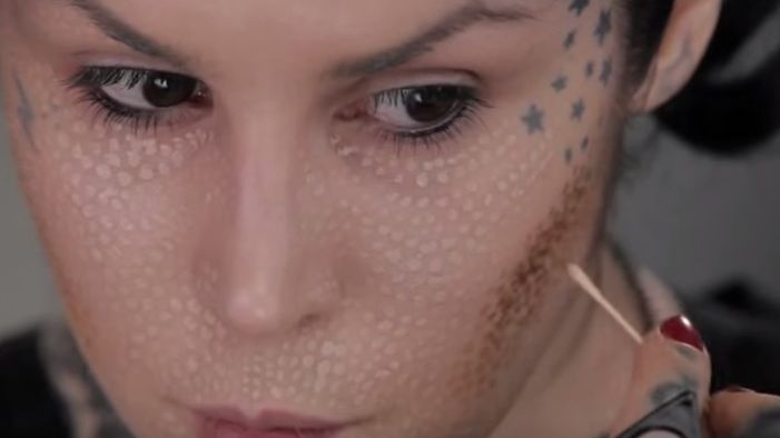 Kat von D rozpoczęła tworzenie oryginalnego makijażu od aplikowania kropek z podkładu. Dzięki palecie różnych odcieni kosmetyku udało jej się osiągnąć nawet efekt konturowania na poszczególnych partiach twarzy.