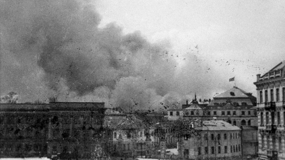 Na zdjęciu: Widok z placu Piłsudskiego na płonące domy w getcie warszawskim.