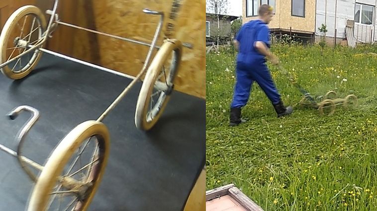 To jest stary stelaż z wózka dla dzieci. Teraz potrzeba nam jednego Rosjanina i kilka minut, żeby zrobić z niego kosiarkę. On sam zresztą wszystko sfotografował i opisał.