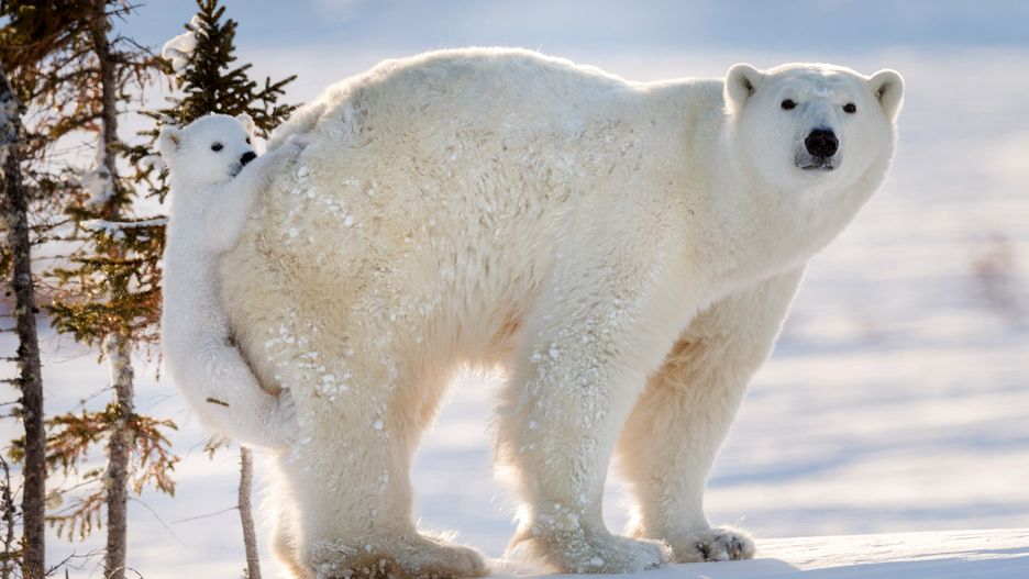 Pierwsze godziny na śniegu okazały się dla jednego z młodych niedźwiedzi na tyle męczące, że postanowił resztę trasy pokonać na grzbiecie mamy.