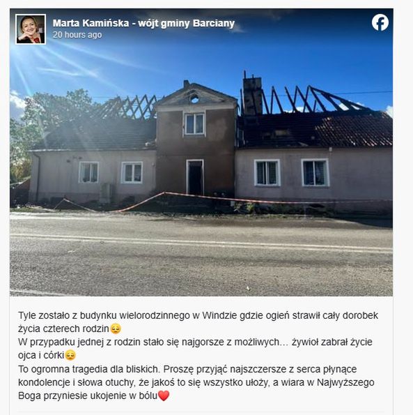 W poniedziałek, 13 października około godz. 1:30 w nocy służby otrzymały informację o pożarze budynku wielorodzinnego w miejscowości Winda w gminie Barciany (woj. warmińsko-mazurskie). Na miejscu rozpoczęła się dramatyczna akcja służb. Podczas prowadzonej akcji gaśniczej na poddaszu budynku znaleziono dwa ciała. To 66-letni mężczyzna i jego 13-letnia córka. Ze wstępnych ustaleń policjantów wynika, że w budynku w chwili zdarzenia przebywało jeszcze 10 osób. Jeszcze przed dojazdem służb ośmioro o własnych siłach opuściło mieszkania.