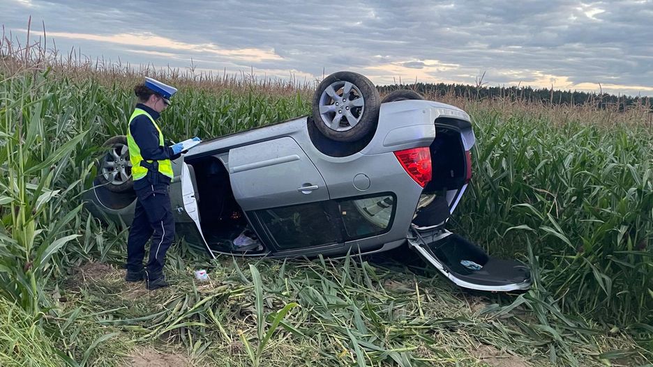 Kiedy kierująca miała zatrzymać się do kontroli, postanowiła przed mundurowymi zawrócić i odjechać. Policyjny pościg zakończył się dla 55-latki niedostosowaniem prędkości i wypadnięciem na łuku drogi w Szamarzewie w kukurydzę.