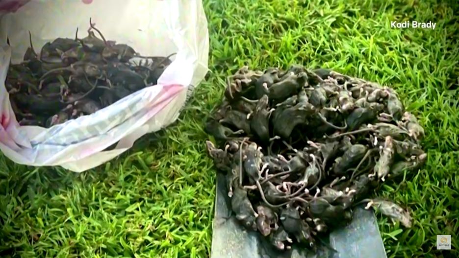 Nagraniem podzielił się z agencją Reutera. Na filmiku widać, jak mężczyzna łopatą przerzuca dziesiątki martwych gryzoni z ziemi do kosza. Jak poinformował, musi robić to codziennie.