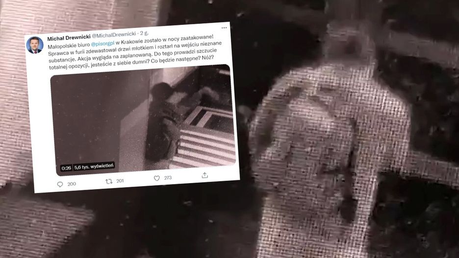 Nieznany sprawca zdewastował biuro PiS w Krakowie (woj. małopolskie). Do ataku doszło w nocy i został on zarejestrowany przez kamery monitoringu. Swojego oburzenia nie kryje m.in. Michał Drewnicki. Polityk PiS zwrócił się do przedstawicieli opozycji.