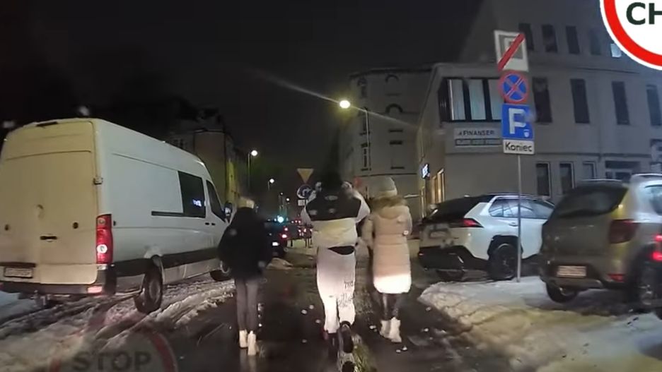 Całą szerokością drogi?! Tędy się nie chodzi kur** - krzyczał kierowca samochodu do pieszych.
