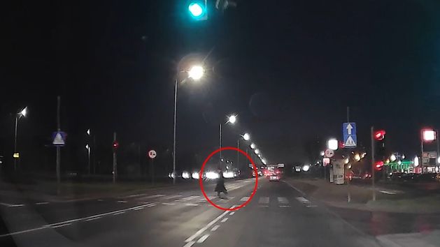 Chwilę później pieszy przebiegł przez przejście dla pieszych na czerwonym świetle, na bardzo ruchliwej drodze z ograniczeniem prędkości do 70 km/h. Starszy mężczyzna za nic miał trąbiące auta. Niewiele brakowało, a doszłoby do dramatu.