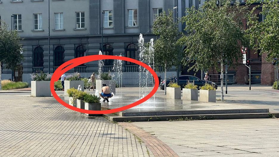 Biały dzień, centrum miasta. Kadry z Katowic. To robił w fontannie. "Przepierka"