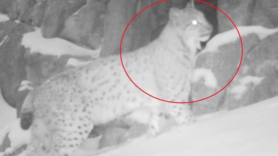 Na krótki wideo z fotopułapki widać, jak ryś rozgląda się dookoła, a następnie wskakuje do jednej z górskich grot, aby schronić się przed intensywnie padającym śniegiem.