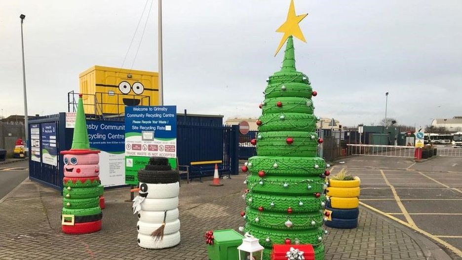 Pracownicy centrum recyclingu przy Estuary Way w Grimsby postanowili stworzyć trochę świątecznego nastroju w swoim miejscu pracy. Użyli nikomu już niepotrzebnych i wyrzuconych rzeczy, dodali koloru, tworząc w ten sposób świąteczne dekoracje.