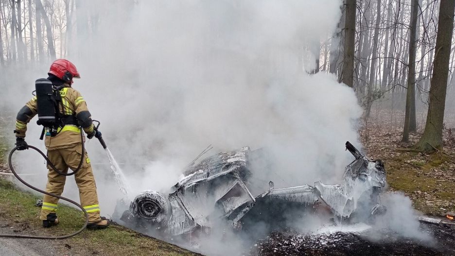 Po zderzeniu osobówka stanęła w płomieniach. Kierujący nią mężczyzna nie miał szans na ratunek, zginął na miejscu. Policja obecnie ustala tożsamość ofiary wypadku.