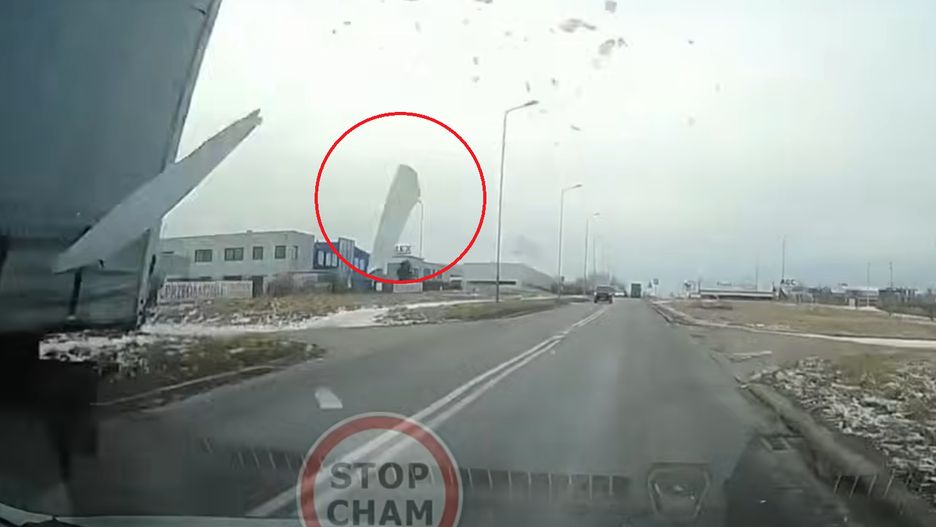 Nagranie z wideorejestratora, opublikowane przez kanał "Stop Cham", pokazuje spokojną, zimową trasę. Na poboczach zalega śnieg, temperatura sprzyja oblodzeniu. Nagle z dachu naczepy odrywa się zamarznięta tafla.