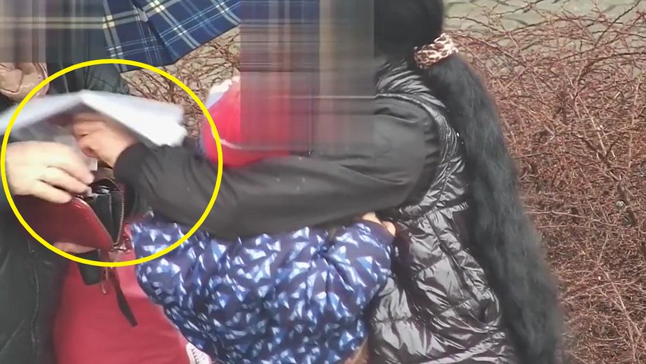 Kiedy seniorka wyciągała portfel kobieta z dzieckiem w tym momencie przysłoniła portfel kartką papieru cały czas prosząc o pieniążki, a drugą ręką zaczęła wyciągać zawartość portfela.