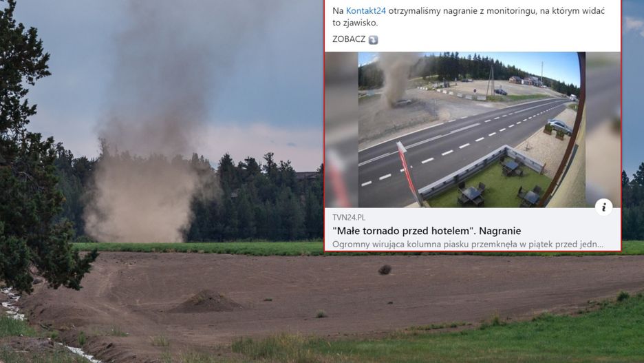Przed jednym z hoteli w Jakuszycach (woj. dolnośląskie) pojawiła się ogromna, wirująca kolumna piasku. Właścicielka obiektu przekazała w rozmowie z TVN24, że dostrzegł ją jeden z gości. Choć wichura na nagraniu wygląda łagodnie, to mężczyzna został uderzony przez wirujące kamienie, a jedno z aut straciło szybę.