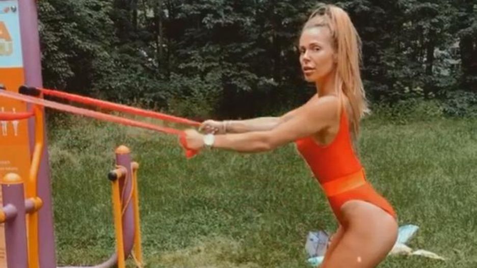 Tym razem trening fizyczny odbył się na łonie natury. Razem z trenerką personalną rzeźbiła ciało przez godzinę ubrana w skąpy jaskrawopomarańczowy strój. Zmęczenie ani leśne owady nie były jej straszne.