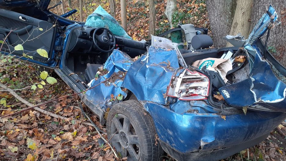 Makabryczny wypadek w Turawie niedaleko Opola. Kierujący osobowym audi wypadł z drogi i z impetem uderzył w drzewo. Samochód został doszczętnie zniszczony, a kierowca nie przeżył.
