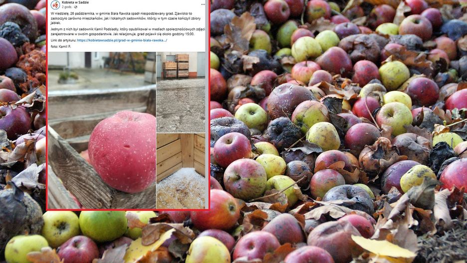 Cytowany przez "Kobietę w sadzie" rolnik opublikował zdjęcia zniszczonych sadów i jabłek dotkniętych opadami. Uszkodzenia mogą utrudnić sprzedaż zbiorów.