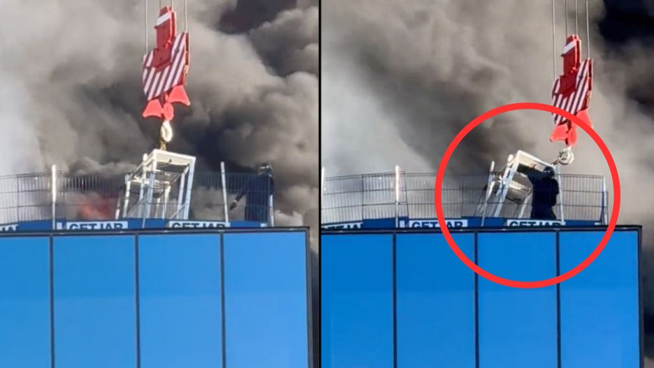 Na nagraniu widać, jak mężczyzna usiłuje dostać się do klatki podstawionej przez dźwig, co nie jest najłatwiejsze ze względu na otaczający go gęsty dym.