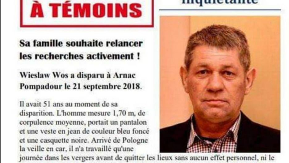 Sprawę nagłośnili redaktorzy programu "Interwencja". Pan Wiesław Woś wyjechał do Arnac-Pompadour, gdzie miał pracować w sadzie zbierając jabłka. Już pierwszego dnia w pracy słuch o nim zaginął.