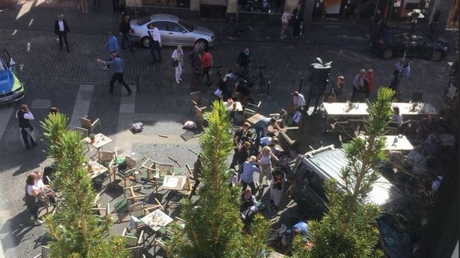 W sobotę o 15:27 w tłum wjechał niewielki samochód dostawczy. Auto zatrzymało się przed budynkiem restauracji Kiepenkerl, znajdującej się w bezpośrednim centrum miasta. Świadkowie zdarzenia twierdzą, że po wypadku z samochodu uciekły dwie osoby.