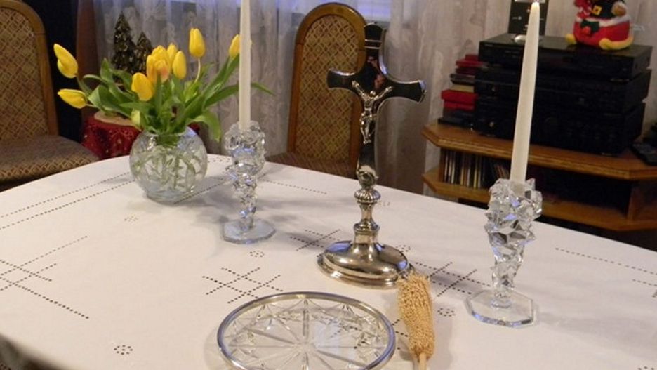 Jak przygotować się do wizyty duszpasterskiej? Nakryj stół białym obrusem, postaw na postaw krzyż i zapalone świece; połóż również Pismo Święte, wodę święconą oraz kropidło. Jeśli nie masz wody święconej, nalej wodę z kraju i poproś kapłana na początku wizyty o jej pobłogosławienie.