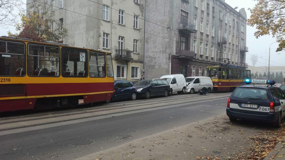 Karambol w Łodzi. Zderzyły się cztery auta i dwa tramwaje