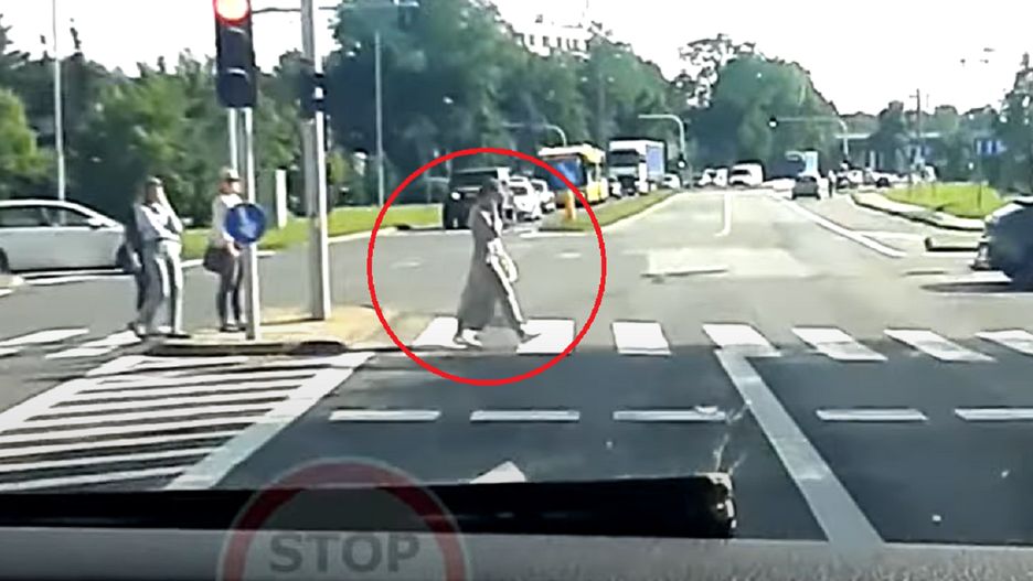 Piesza nie spojrzała nawet w stronę pędzącej karetki pogotowia, mimo że kierowca w ostatniej chwili wyhamował, unikając potrącenia kobiety. Na nagraniu słychać głośne sygnały dźwiękowe.